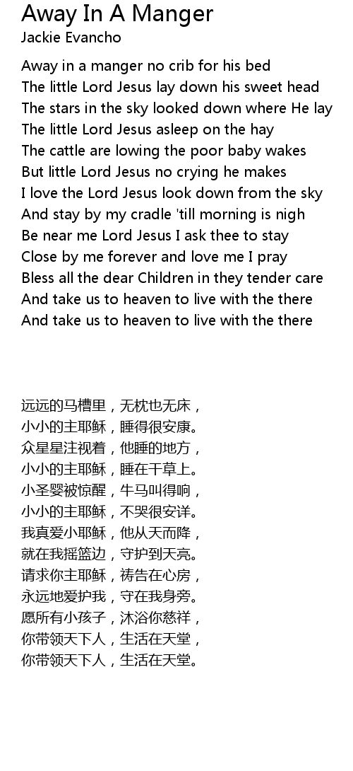 Away in a manger no crib for his bed |