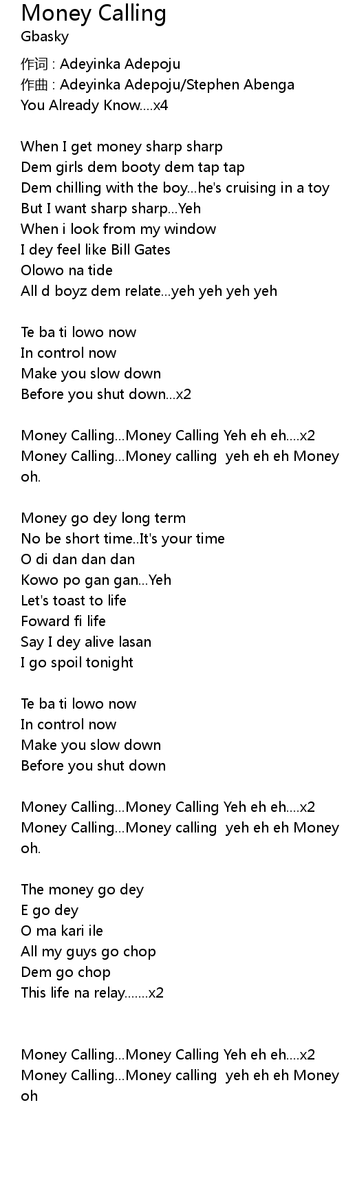 | Money Calling...Money calling yeh eh eh Money Calling..Money Calling Kowo ma bo oh |