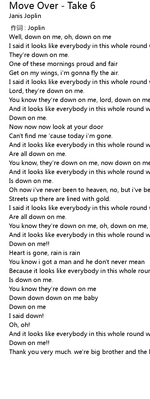 | [00:48.19] | You know they' re down on me, lord, down on me, oh, oh |