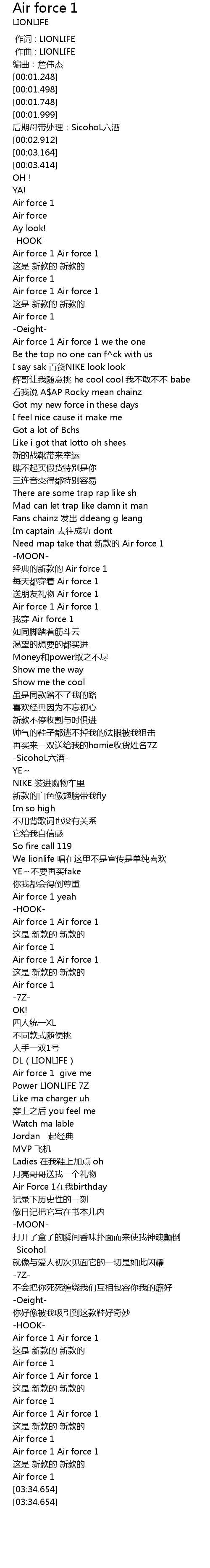 | [00:55.262] | Need map take that xīn kuǎn de Air force 1 |