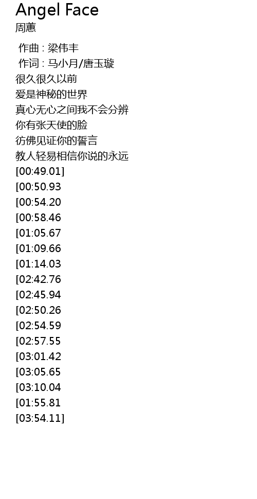 | [03:32.28][02:57.55][01:36.75] | Angel nǐ de liǎn |
