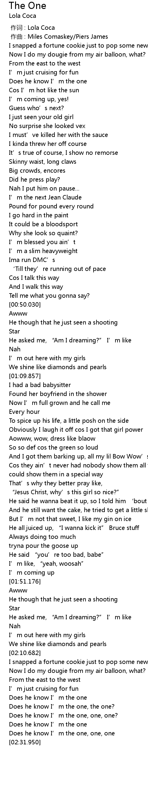 | [02:28.395] | Does he know I' m the one, one, one |