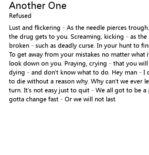 Lust and flickering - As the needle pierces trough. Flickering, twitching - as the drug gets to you. Screaming, kicking - as the pain emerges. Shattered and broken - such as deadly curse. In your hunt to find happiness and peace of mind. To get away from your mistakes no matter what it takes. Waiting, hoping - as I look down on you. Praying, crying - that you will make it through. Fading and dying - and don't know what to do. Hey man - I didn't even know you. Another one to die without a reason why. Why can't we ever learn? Soon it might be your turn. It's not easy just to quit - We all got to be a part of it. Something's gotta change fast - Or we will not last. |
