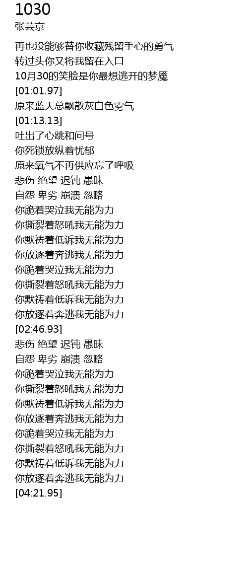 | [02:30.84] | 你撕裂着怒吼我无能为力 |