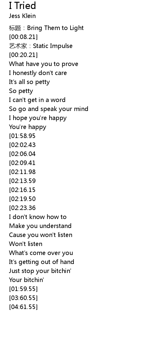 | [01:21.79][02:23.36][03:45.57] | Remember I tried |