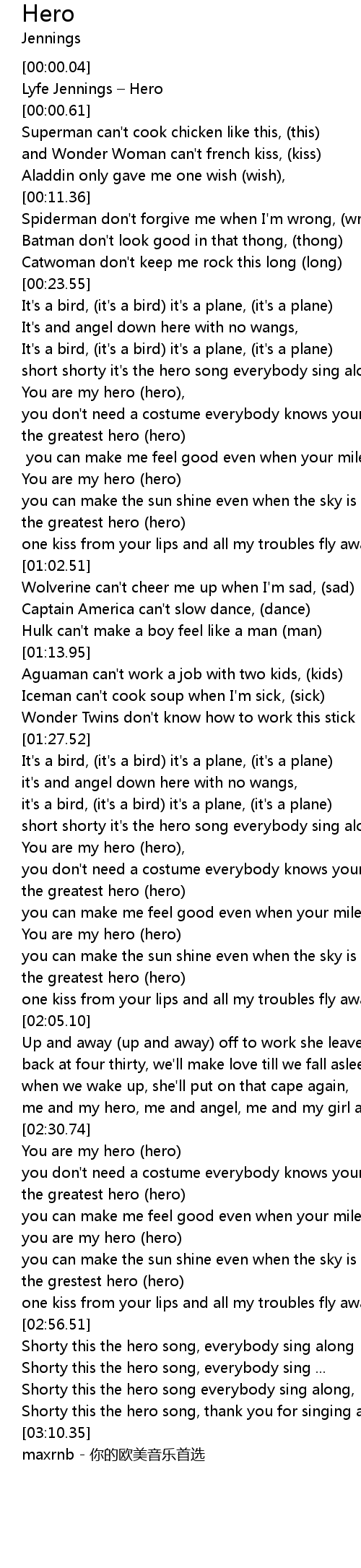 | [00:00.26] | Lyfe Jennings – Hero |