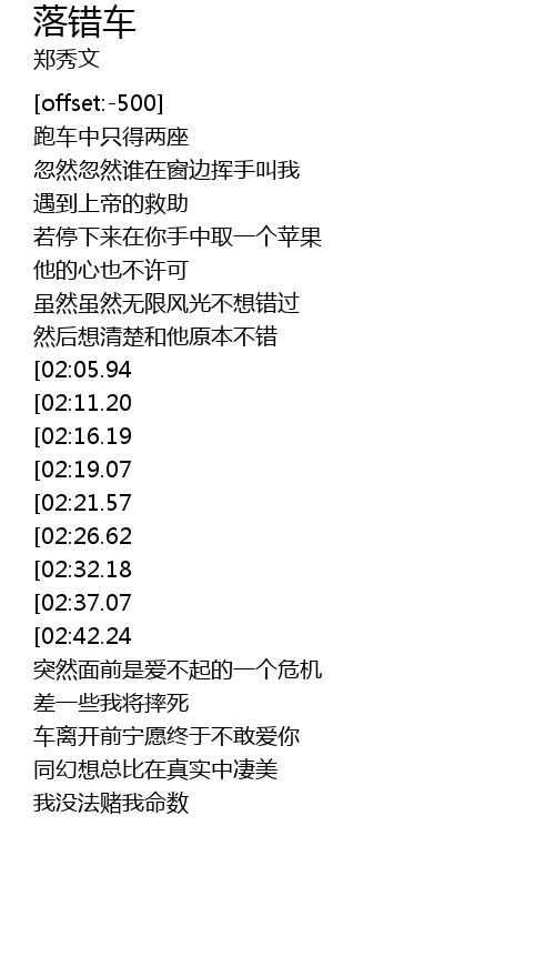 | [02:50.31][02:05.94][00:55.40] | 落错车如离开了幸福的高速路 |