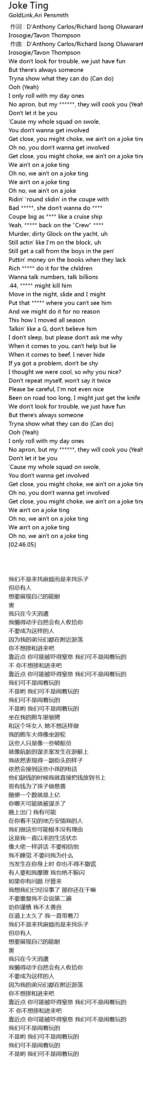 | [02:39.00] | We ain't on a joke ting |