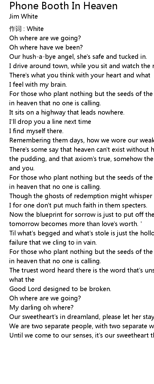 | There's some say that heaven can't exist without hell, well if the proof's in the pudding, and that axiom's true, somehow the heart of the matter escaped me and you. | |