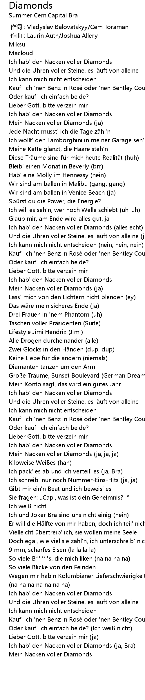 | [00:26.32] | Mein Nacken voller Diamonds (ja) |
