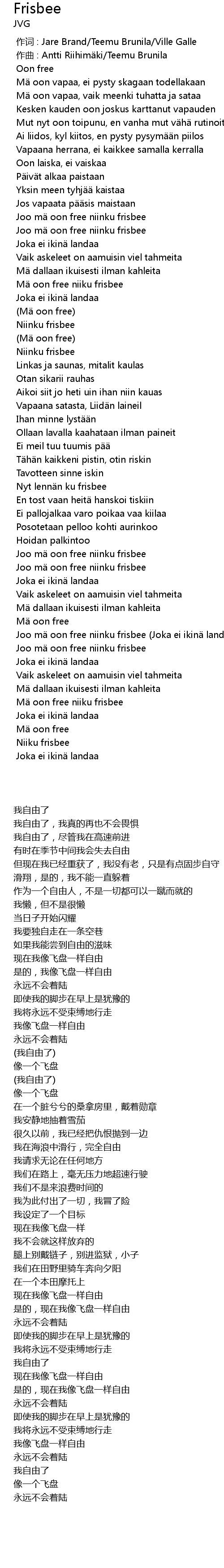 | [02:29.200] | Joo m oon free niinku frisbee Joka ei ikin landaa |