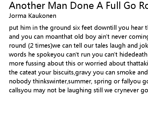 put him in the ground six feet downtill you hear that coffin soundyou can weep and you can moanthat old boy ain't never coming homeanother man done a full go round (2 times)we can tell our tales laugh and jokeponder all day about the words he spokeyou can't run you can't hidedeath come creeping up by your sideno more fussing about this or worried about thattaking out the dog or letting in the cateat your biscuits,gravy you can smoke and drinkain't going to matter what nobody thinkswinter,summer, spring or fallyou got to go when the good lord callsyou may not be laughing still we crynever got a chance to say good-bye |