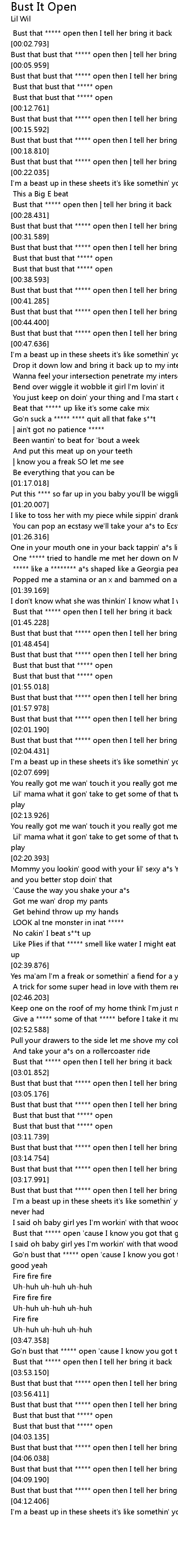 | [03:01.852] | Bust that bust that ***** open then I tell her bring it back |