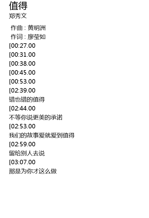 | [03:28.00][02:53.00][01:15.00] | 我可以对自己承诺 我们的故事爱就爱到值得 |