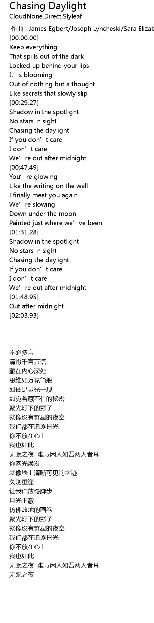 | [01:39.53] | Chasing the daylight |