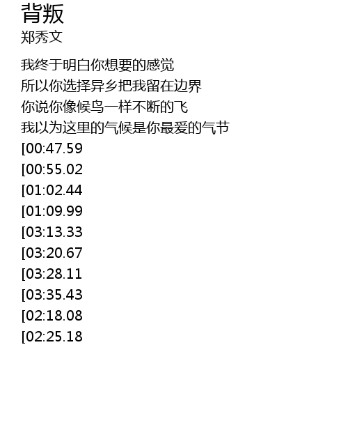 | [02:41.43][00:47.59] | 我后来发现背叛其实没有罪 |