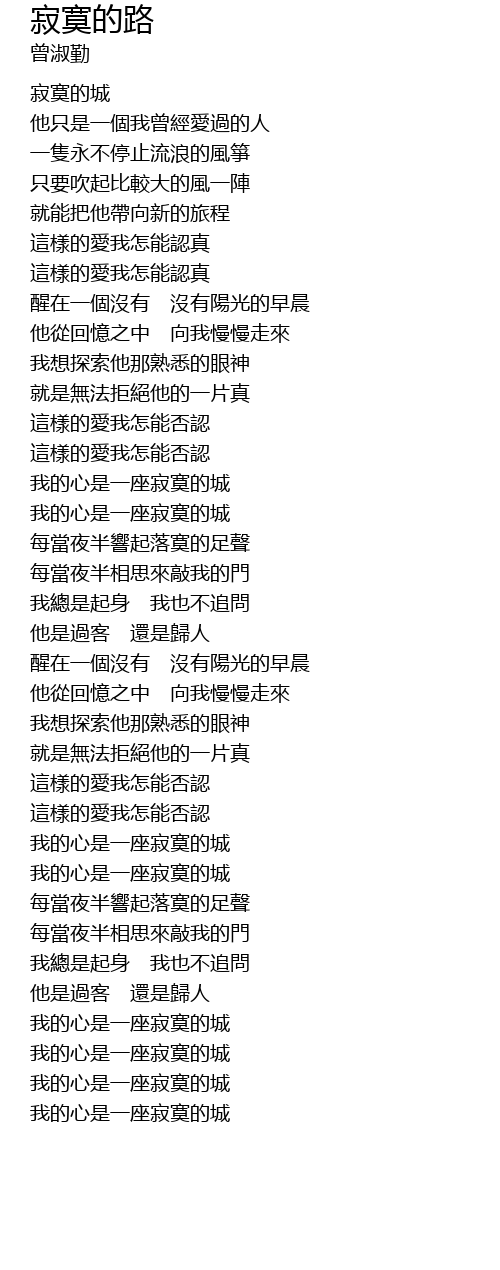 | [04:08.76] | 我的心是一座寂寞的城 |