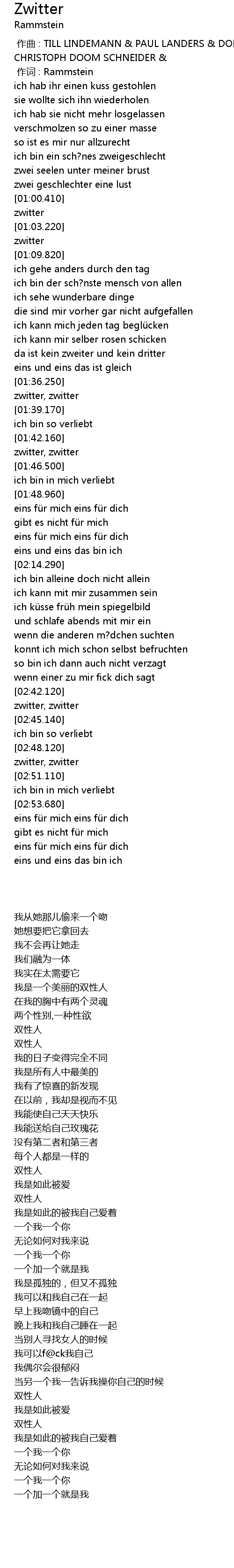 | [00:00.00] | 作曲 : TILL LINDEMANN & PAUL LANDERS & DOKTOR CHRISTIAN LORENZ & CHRISTOPH DOOM SCHNEIDER & |