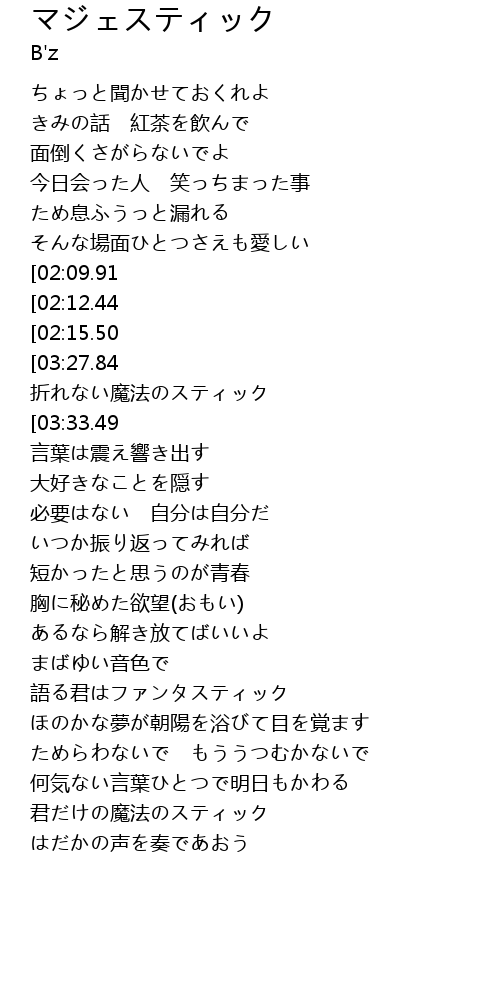 | [01:02.31][02:12.44][03:17.91] | 君の声はマジェスティック |
