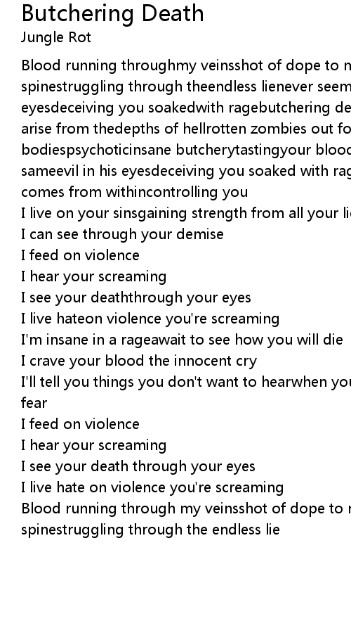 Blood running throughmy veinsshot of dope to my braincracking down your****ing spinestruggling through theendless lienever seems to look thesameevil in his eyesdeceiving you soakedwith ragebutchering deathafter death we willawakeand arise from thedepths of hellrotten zombies out forbloodbutchering andmutilating bodiespsychoticinsane butcherytastingyour blood from menever seems to look the sameevil in his eyesdeceiving you soaked with ragebutchering deathevil that comes from withincontrolling you |