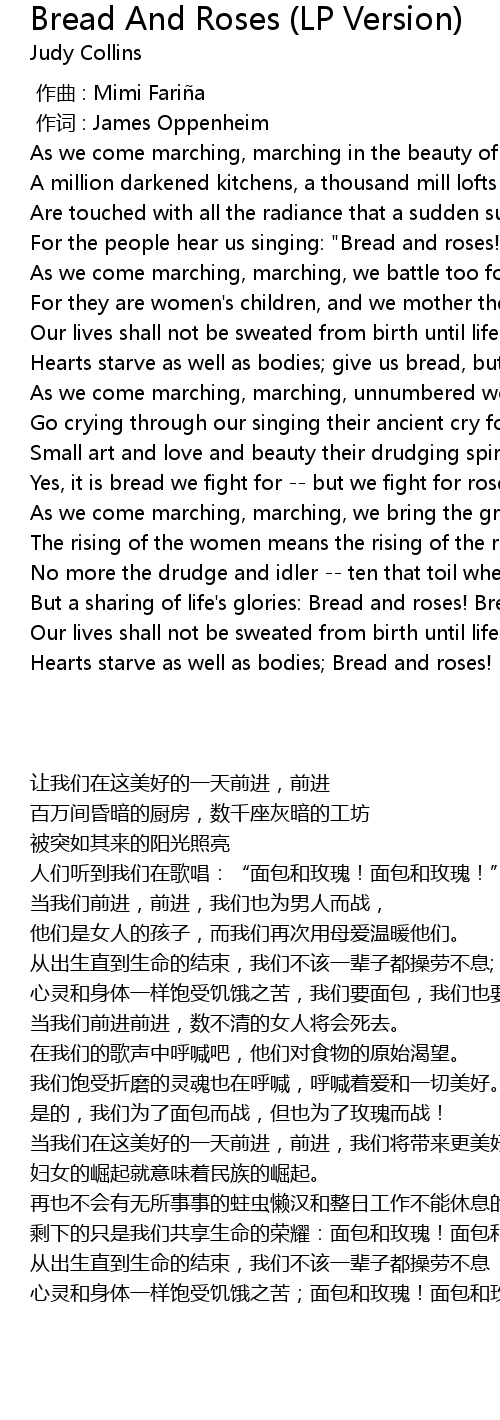 | [02:48.000] | Hearts starve as well as bodies Bread and roses! Bread and roses! |