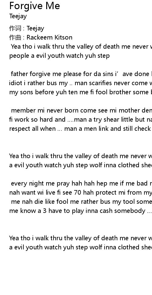| Cho father forgive me please for da sins i' ave done before me dead like idiot i rather bus my .. man scarifies never come with ease for my daughter and my sons before yuh ten me fi fool brother some body have to . | |
