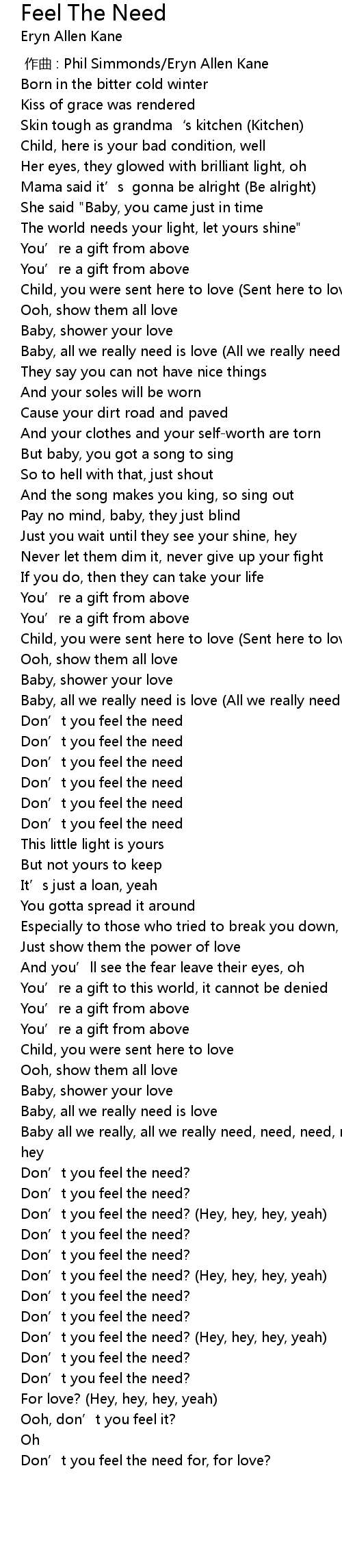 | [03:06.77] | Don’t you feel the need? |