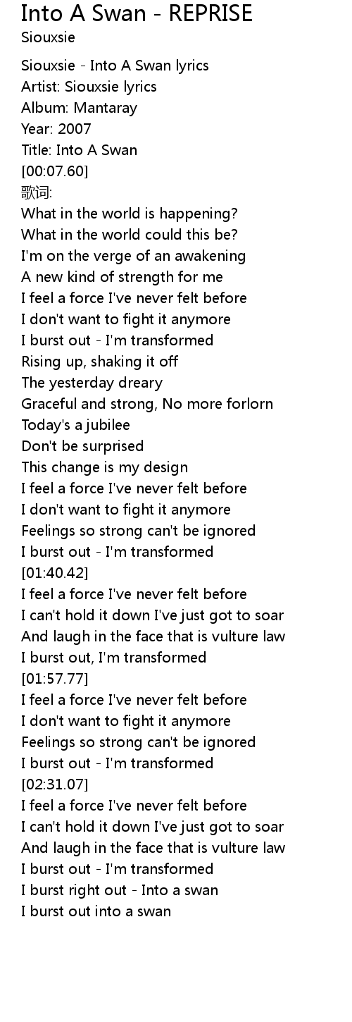 | [00:01.54] | Siouxsie Into A Swan lyrics |