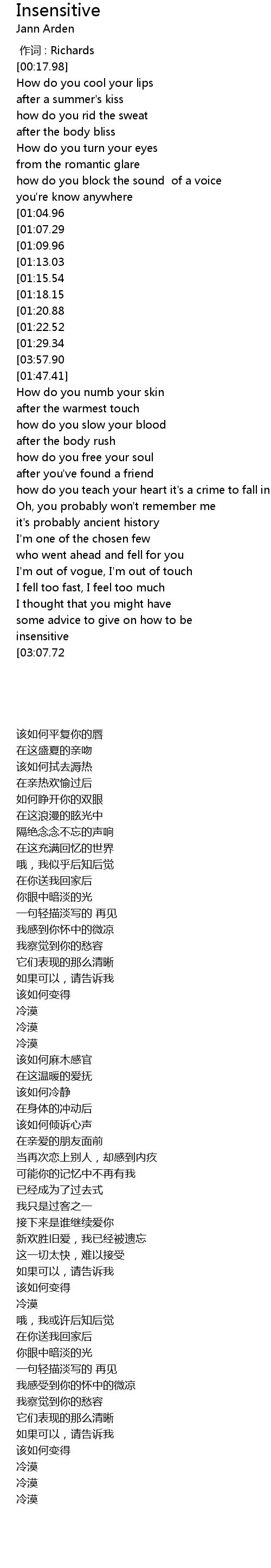 | [04:03.12][03:57.90][03:52.42][01:42.12][01:36.80][01:31.46] | insensitive |