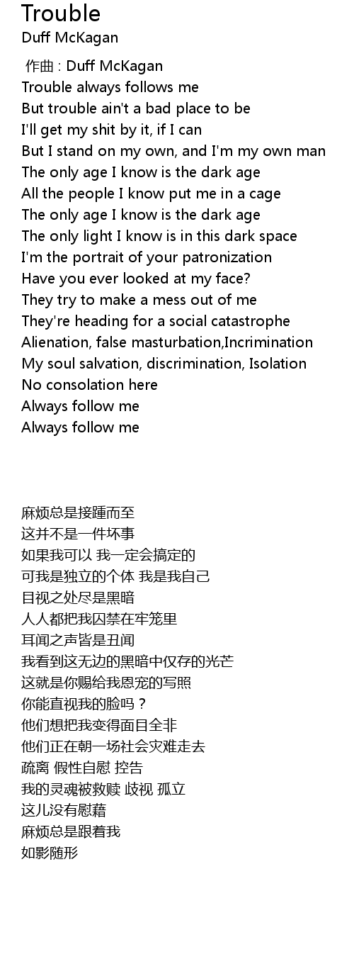 | [00:31.244] | Trouble always follows me |