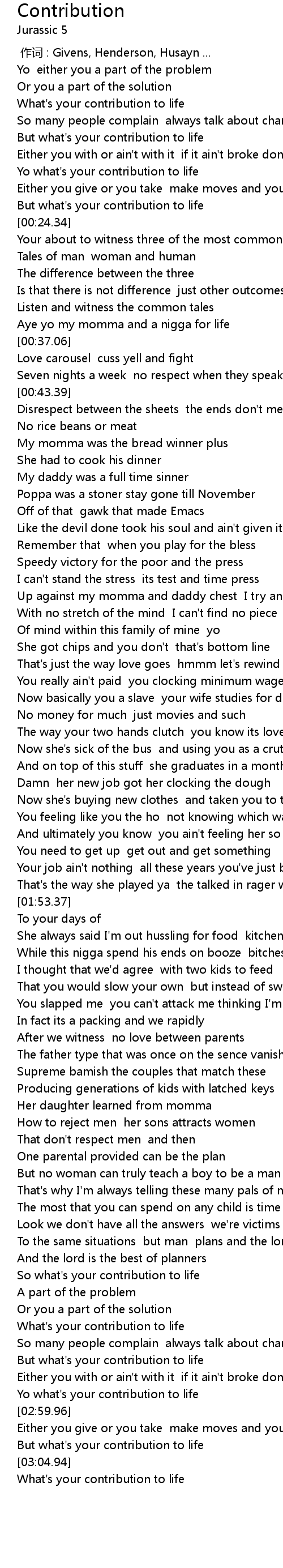 | [02:57.90] | Yo what' s your contribution to life |