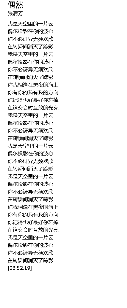 | [03:22.26] | wǒ shì tiān kōng lǐ de yī piàn yún |