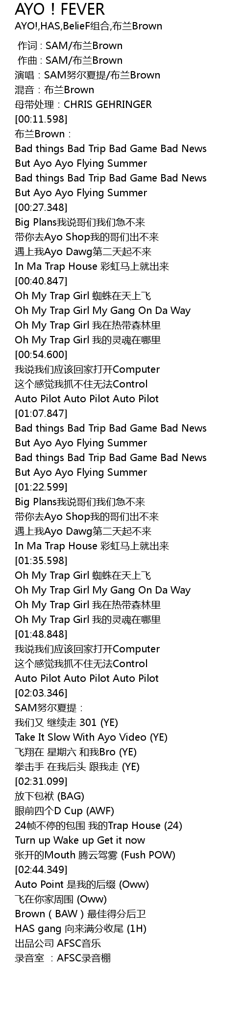 | [01:26.597] | dài nǐ qù Ayo Shop wǒ de gē men chū bù lái |