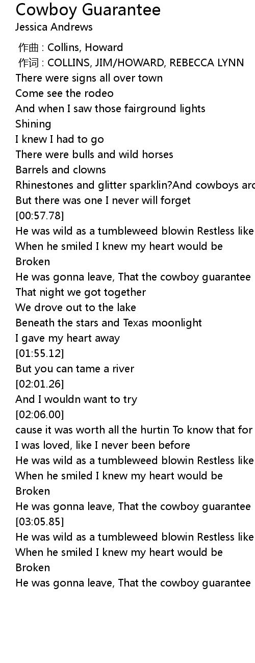 | [02:55.79] | He was gonna leave, That the cowboy guarantee |