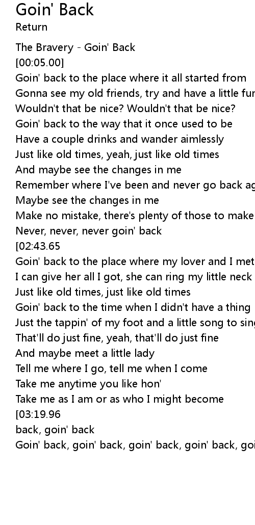 | [03:23.69][03:19.96][03:16.45][03:12.92][03:08.56] | Goin' back, goin' back, goin' back, goin' back |