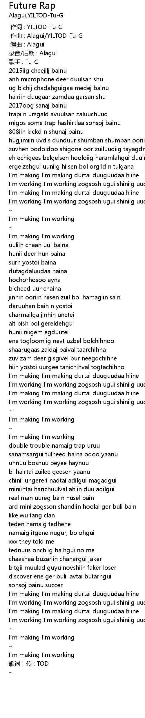 | [03:01.550] | I' m working I' m working zogsosh ugui shiniig uudnee |