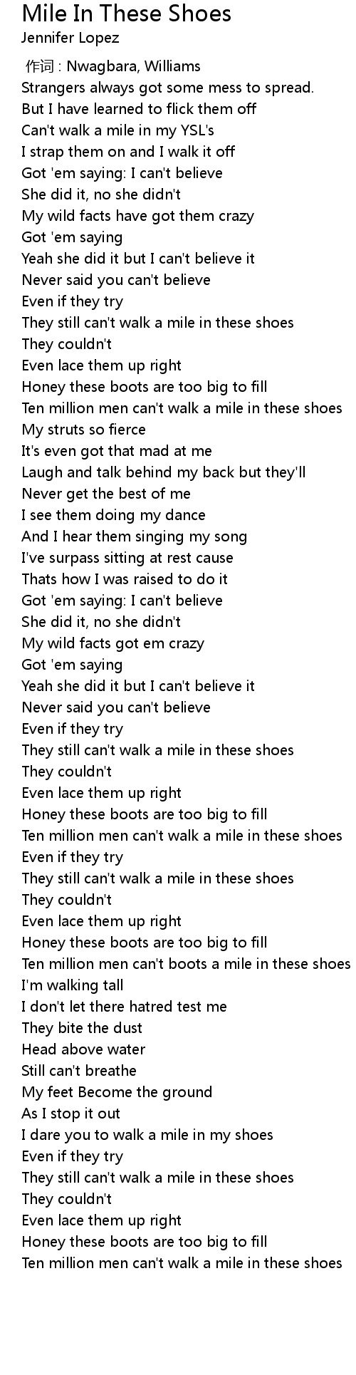| [01:56.28] | Ten million men can' t walk a mile in these shoes |