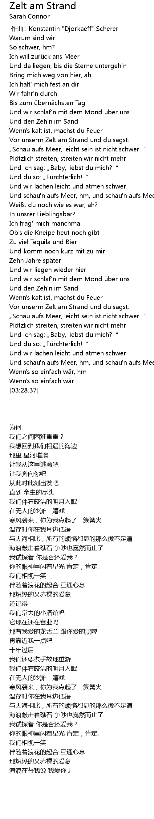 | [02:33.48] | Vor unserm Zelt am Strand und du sagst: |