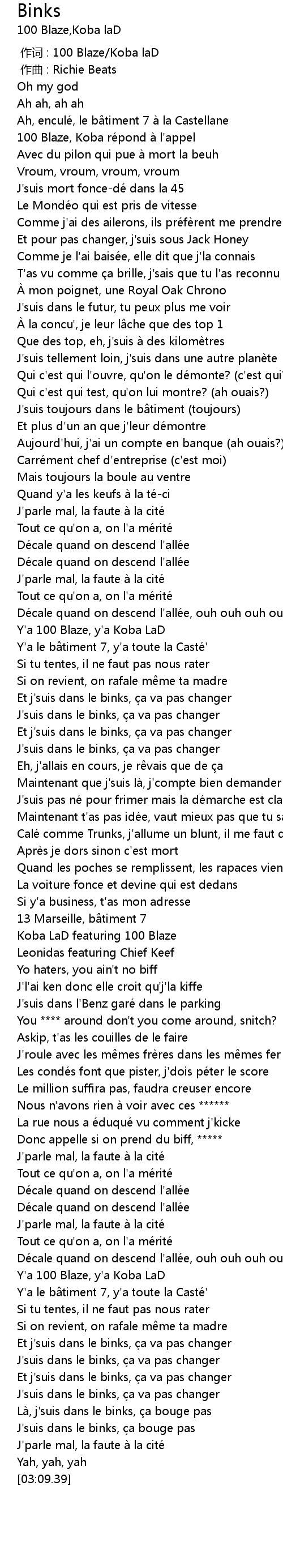 | [02:58.84] | J' suis dans le binks, a bouge pas |