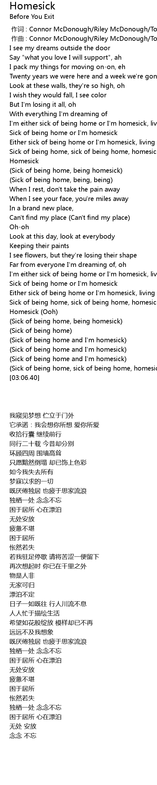 | [03:00.88] | (Sick of being home, sick of being home, homesick) |