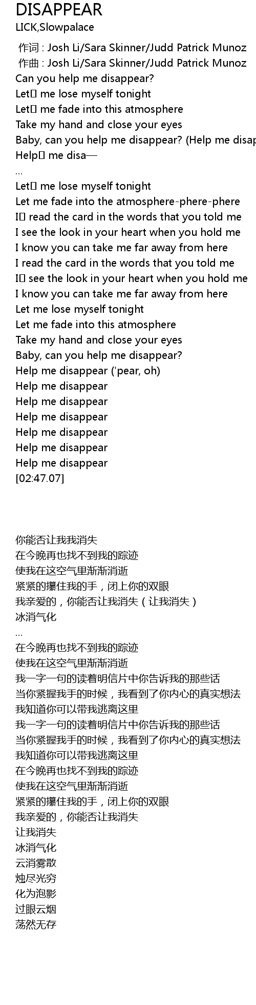 | [00:31.80] | Baby, can you help me disappear? Help me disappear |