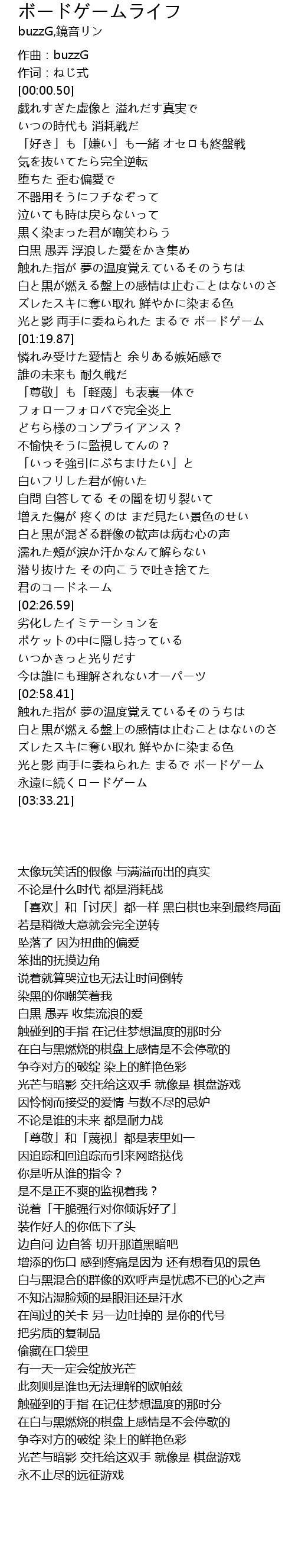 | [03:21.72] | 光と影 両手に委ねられた まるで ボードゲーム |