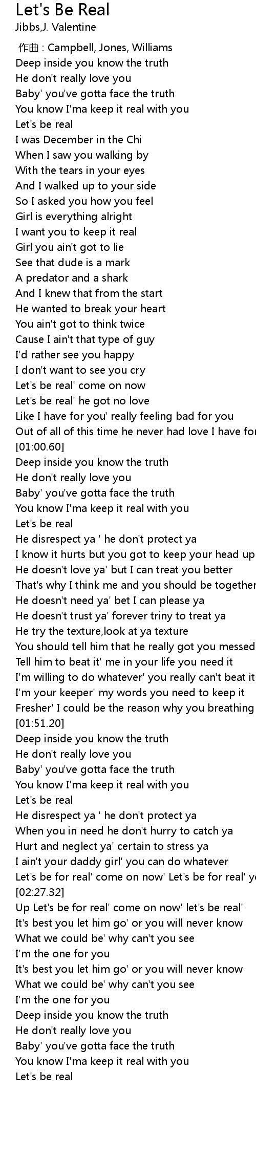 | [02:27.89] | Up Let's be for real' come on now' let's be real' |