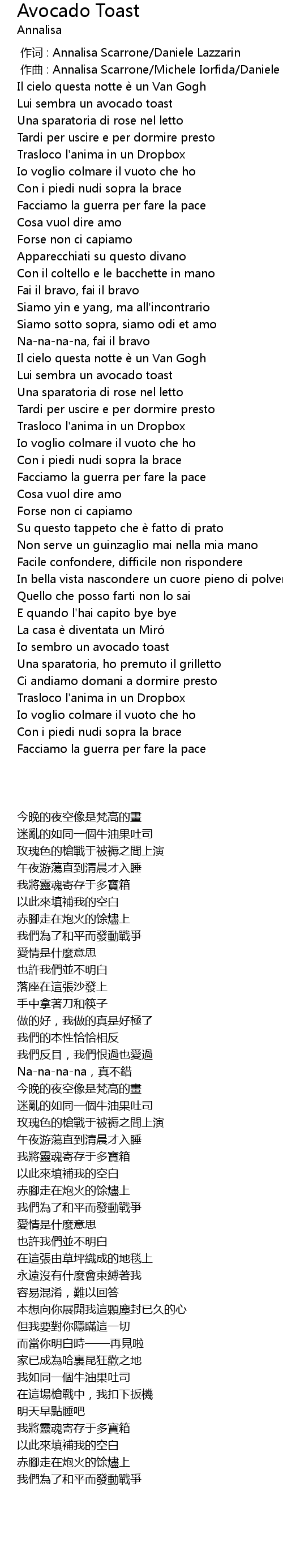 | [02:00.13] | 我如同一個牛油果吐司 |