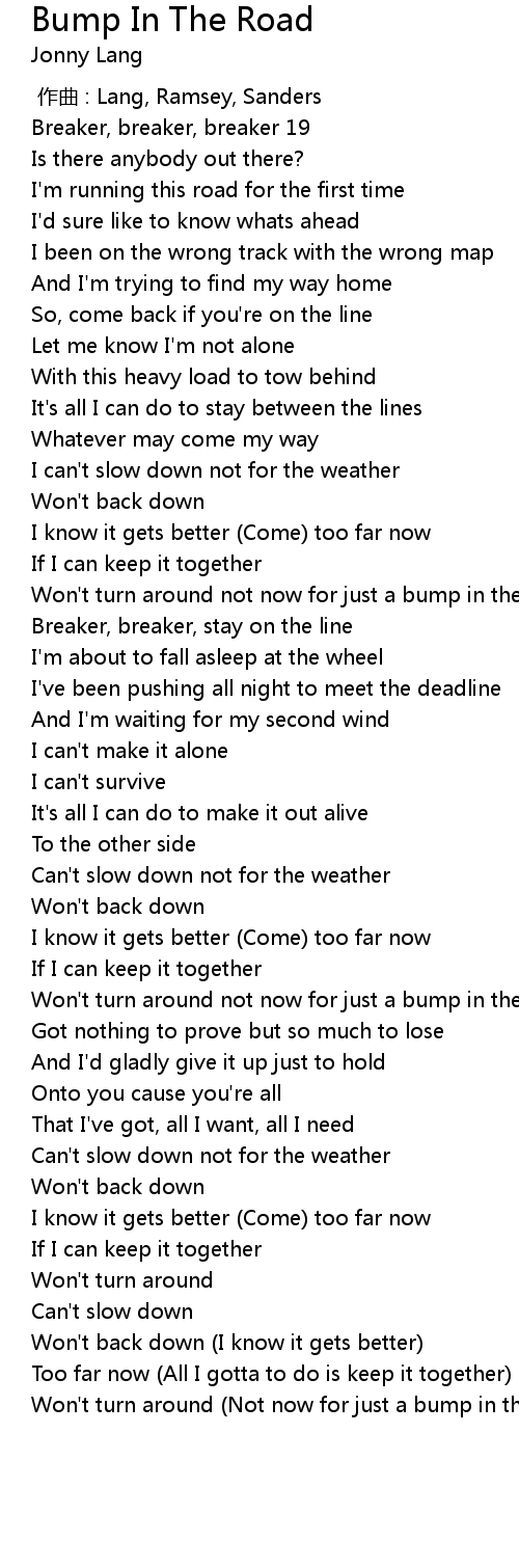 | [02:54.20] | Won' t turn around Not now for just a bump in the road |