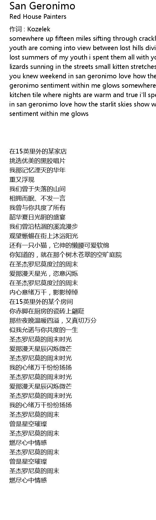 | somewhere up fifteen miles sifting through crackling vinyl lost memories of my youth are coming into view between lost hills divide quietly we sleep inside lost summers of my youth i spent them all with you take ways by withered creeks lizards sunning in the streets small kitten stretches through green empty yards you knew weekend in san geronimo love how the starlit skies show weekend in san geronimo sentiment within me glows somewhere up fifteen miles barefoot on kitchen tile where nights are warm and true i' ll spend them all with you weekend in san geronimo love how the starlit skies show weekend in san geronimo sentiment within me glows |