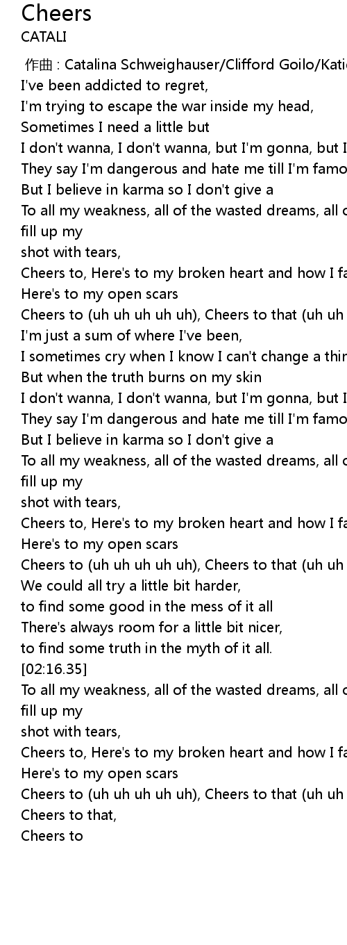 | [01:39.17] | Cheers to, Here's to my broken heart and how I fall apart, |