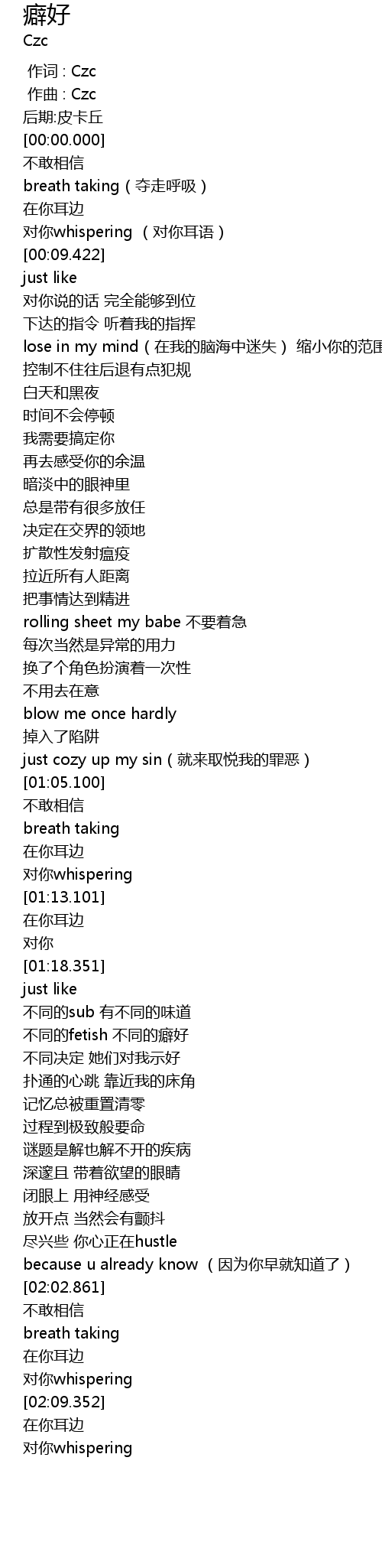 | [01:32.601] | 不同的fetish 不同的癖好 |