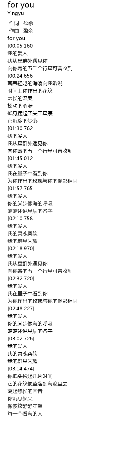 | [02:30.474] | 向你寄的五千个行星可曾收到 |
