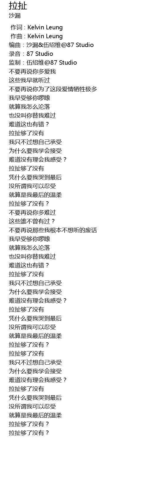 | [00:18.000] | 编曲:沙漏&伍绍维@87 Studio |